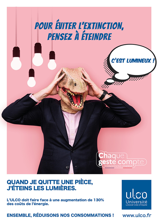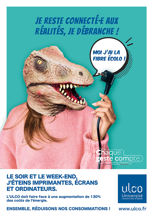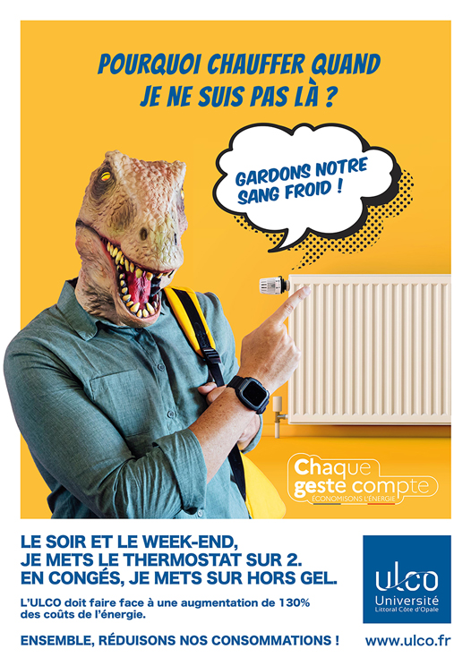 Pour impliquer l’ensemble de la communauté universitaire, l’ULCO a lancé en janvier 2023 une campagne de communication autour des éco-gestes. Avec humour et créativité, ces affiches rappellent que chaque geste compte pour réduire notre consommation d’énergie.